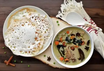 The iconic breakfast staple, Appams are soft-centred, bowl-shaped pancakes made from fermented rice batter, paired with a mild and creamy vegetable or chicken stew simmered in coconut milk. The gentle sweetness of the appam perfectly complements the subtle spices of the stew, creating a comforting combination that wakes many Kerala houses.