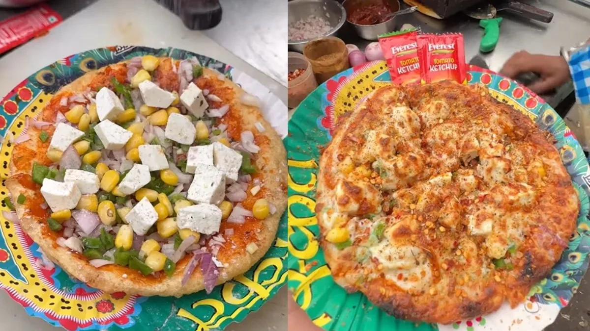 The viral video, reportedly shot near the GTB Nagar Metro Station, shows a vendor transforming a bhatura into a pizza base. Instead of chole, the bhatura is layered with tomato sauce, chopped onions, capsicum, sweet corn and shredded paneer.