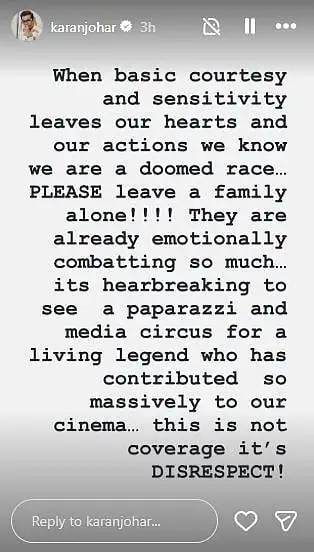 After Sunny’s video of shouting at the paparazzi went viral, many celebrities took to social media to slam the paps. Karan Johar on his Instagram story posted, “When basic courtesy and sensitivity leaves our hearts and our actions we know we are a doomed race… PLEASE leave a family alone!!!! They are already emotionally combatting so much… “Its hearbreaking to see a paparazzi and media circus for a living legend who has contributed So massively to our cinema… this is not coverage it’s DISRESPECT! (sic).”