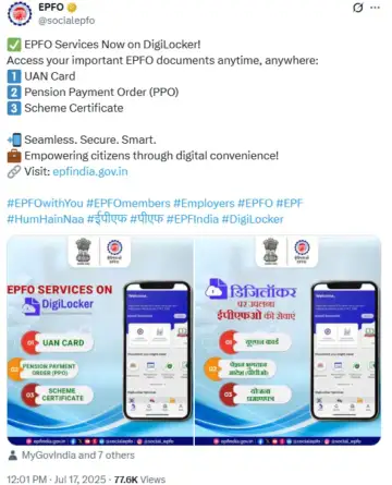 EPFO announced this update on X, “EPFO Services Now on DigiLocker! Access your important EPFO documents anytime, anywhere:UAN Card, Pension Payment Order (PPO), Scheme Certificate. Seamless. Secure. Smart. Empowering citizens through digital convenience!”