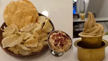 Papadum Platter, Seviya Payasam and Filter Coffee SoftyI started off with the quintessential filter coffee that was served in the traditional brass tumbler. Interestingly, I wrapped up my meal with a Filter Coffee Softy (ice cream) that was served in the same golden cup set. While the former was as authentic as filter coffee can get, the rich, creamy, mild brown, coffee-flavoured dessert was not overly sweet but had a slightly bitter taste and strong hints of chicory.