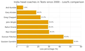 Since the John Wright era began in 2000, India have had seven full-time head coaches before Gambhir. Their Test records, in terms of losses, all live in a relatively narrow band between 5% and 33%. Gambhir is an outlier.