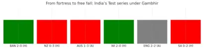 - Home: India have five defeats in nine home Tests under Gautam Gambhir – clean sweeps by New Zealand and South Africa on Indian soil, against just two 2-0 wins over Bangladesh and the West Indies.
