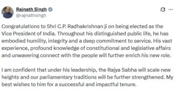 “Congratulations to CP Radhakrishnan ji on being elected as the Vice President of India. Throughout his distinguished public life, he has embodied humility, integrity and a deep commitment to service. His vast experience, profound knowledge of constitutional and legislative affairs and unwavering connect with the people will further enrich his new role,” he tweeted.