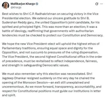 “Best wishes to CP Radhakrishnan on securing victory in the Vice Presidential election. We extend our sincere gratitude to Shri B Sudershan Reddy garu, the united Opposition’s joint candidate, for his spirited and principled fight. This was more than an election; it was a battle of ideology, reaffirming that governments with authoritarian tendencies must be checked to protect our Constitution and democracy,” he tweeted.