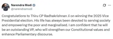 “Congratulations to Thiru CP Radhakrishnan Ji on winning the 2025 Vice Presidential election. His life has always been devoted to serving society and empowering the poor and marginalised. I am confident that he will be an outstanding VP, who will strengthen our Constitutional values and enhance Parliamentary discourse,” he wrote on X.