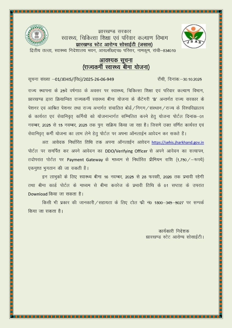 Ranchi:  झारखंड सरकार के स्वास्थ्य, चिकित्सा शिक्षा एवं परिवार कल्याण विभाग के अंतर्गत झारखंड स्टेट आयुर्विज्ञान सोसाइटी (JSAS) ने राज्यकर्मी स्वास्थ्य बीमा योजना (राज्यकर्मी स्वास्थ्य बीमा योजना – SEHIS) से जुड़ा एक official notice जारी किया है।State Employee Health Insurance की तिथि फिर से जारी होने का कर्मचारियों ने स्वागत किया है।