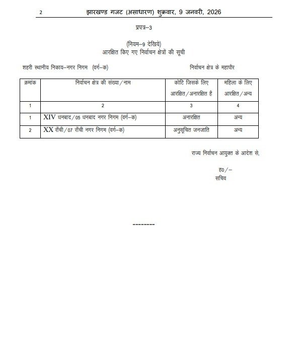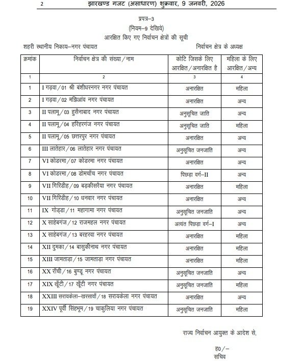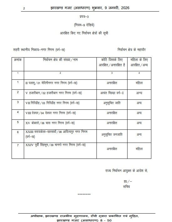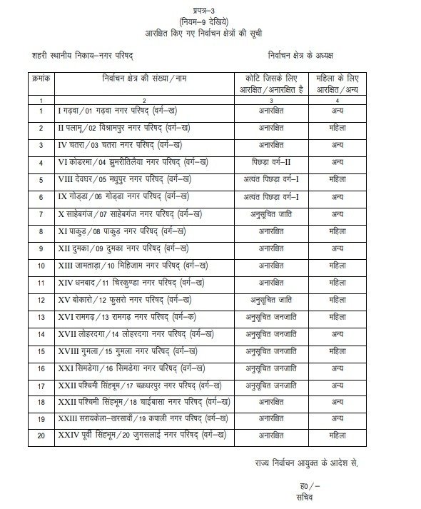 झारखंड ब्रेकिंग: नगरीय निकाय चुनाव में आरक्षण की अधिसूचना जारी, जानिये कौन-कौन नगर निगम, नगर परिषद और नगर पंचायत में है आरक्षण
