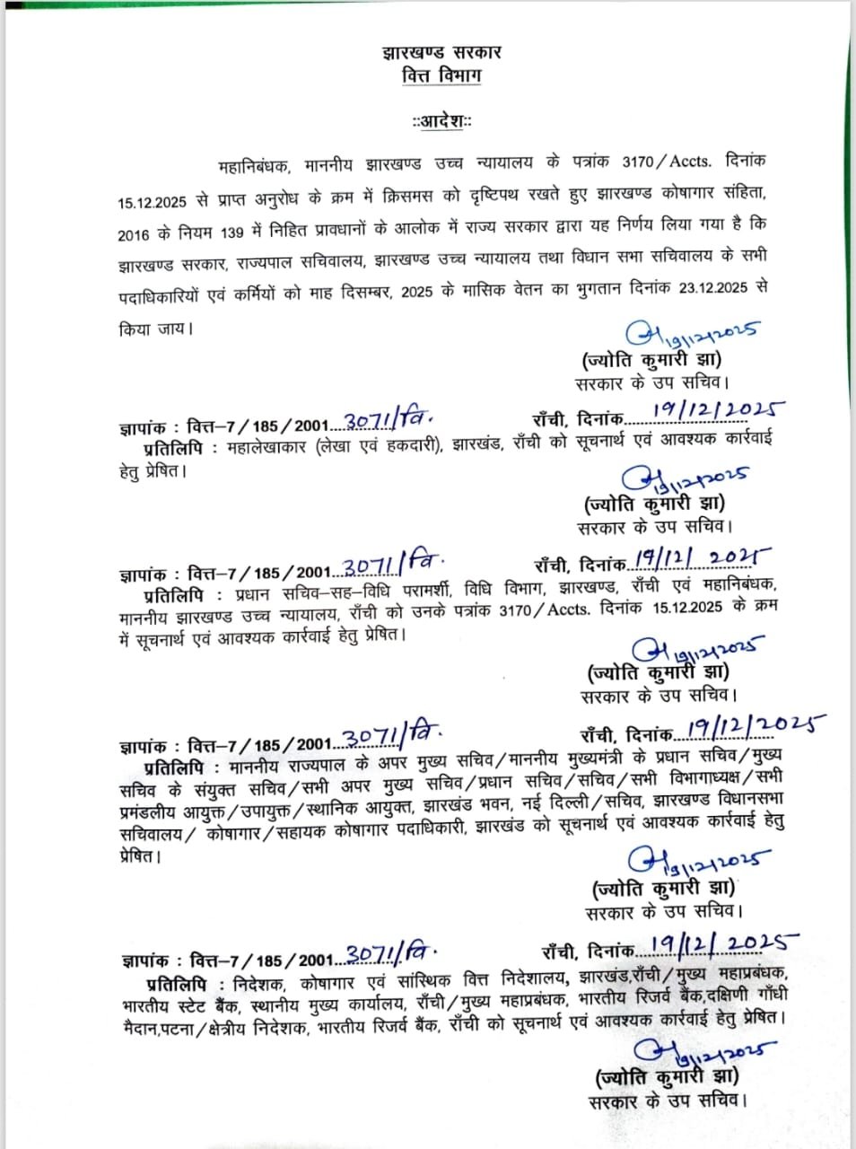 राज्य सरकार ने फैसला लिया है कि झारखंड सरकार, राज्यपाल सचिवालय, झारखंड हाईकोर्ट और विधानसभा सचिवालय के सभी पदाधिकारियों व कर्मियं को दिसंबर महीने का वेतन 23 दिसंबर से मिलना शुरू हो जायेगा। राज्य सरकार की उपसचिव ज्योति कुमारी झा ने इस संबंध में आदेश जारी किया है।