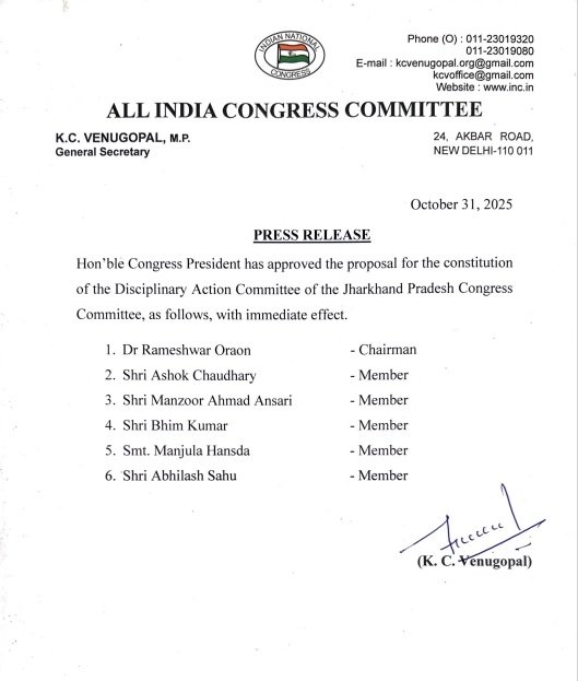 झारखंड कांग्रेस में नियुक्ति: रामेश्वर उरांव बने अनुशासन समिति के चेयरमैन, AICC ने किया 6 सदस्यीय कमेटी का ऐलान