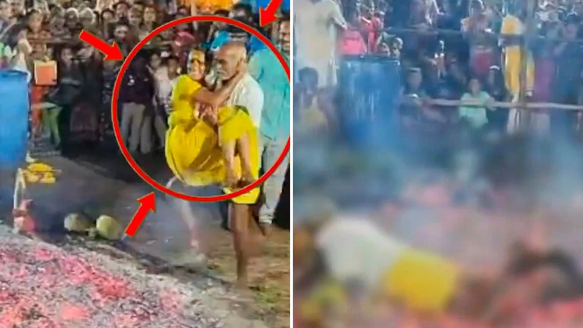 The video of the incident shows a woman dressed in yellow attire pausing before stepping onto the coals. An elderly man in traditional clothing then tries to assist her by lifting her onto his shoulders. However, as he stepped into the pit, he stumbled and lost balance, causing both to fall directly into the fire. According to local media reports, the two sustained serious burn injuries as a result.