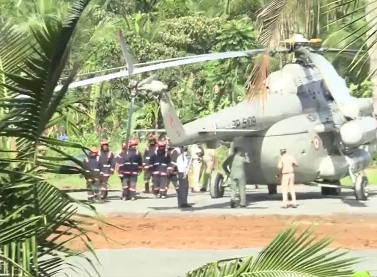 #WATCH | Kerala: A portion of the helipad tarmac sank in after a chopper carrying President Droupdi Murmu landed at Pramadam Stadium. Police and fire department personnel deployed at the spot physically pushed the helicopter out of the sunken spot. pic.twitter.com/QDmf28PqIb